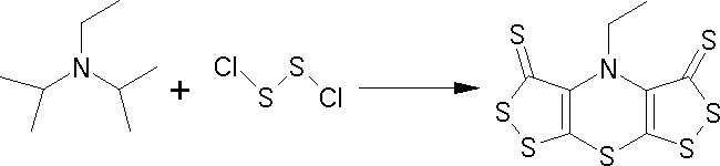 with disulfur dichloride (sulfur monochloride) to give the bis([1,2]dithiolo)-[1,4]thiazine (Scorpionine) in an overall yield of 40%.