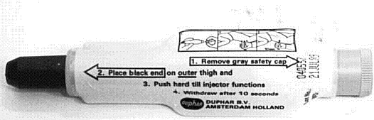 Below is an artist's impression of an atropine autoinjector used by the Dutch Armed Forces. Each marine is supplied with three autoinjectors. If VX exposure is indicated, a fellow soldier uses one autoinjector in the victim's thigh every six minutes.