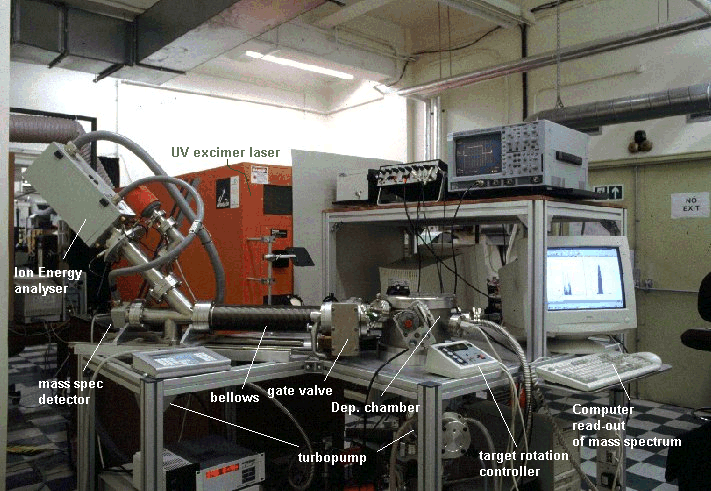 The target takes the form of a 50 mm disk mounted on a shaft attached via a double 'O' ring seal to a stepper motor. This enables the target to be rotated during ablation to prevent deep crater formation, allowing longer deposition times and reducing the number of large particulates being sputtered from the target and being incorporated into the films. In earlier experiments the target took the form of a cylindrical rod suspended vertically from the lid of the vacuum chamber, and translated and rotated via a stepper motor. The shot-to-shot reproducibility of such an arrangement is extremely sensitive to any eccentricity in the rod rotation. Thus the present set-up employs a side mounted rotating disk with the laser normally incident at an angle of 45°.